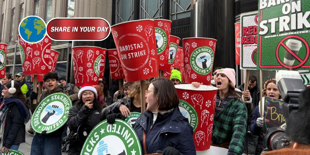 The rally, which brought together hundreds of workers, union members, and supporters, took place in front of the iconic skyscraper, home to a bustling three-floor Starbucks Reserve and the company’s regional headquarters. The event also coincided with the holiday shopping rush, intensifying the impact as both tourists and locals filled the streets.